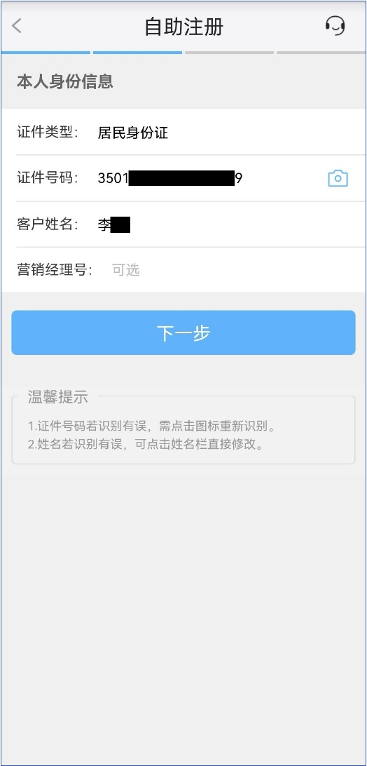 ③. 在客戶身份信息錄入頁面,點擊右邊的照相機圖標,頁面跳轉ocr識別,用戶使用手機后置攝像頭掃描身份證正面,頁面自動識別身份證號碼與姓名,并回填在頁面上,用戶輸入經銷經理號(可以不填),點擊下一步。