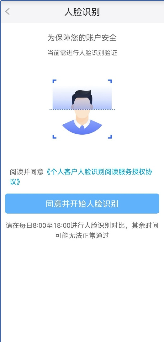 ④.用戶在人臉識別引導頁點擊同意并開始人臉識別,進入人臉識別頁面,按照頁面提示完成人臉識別。