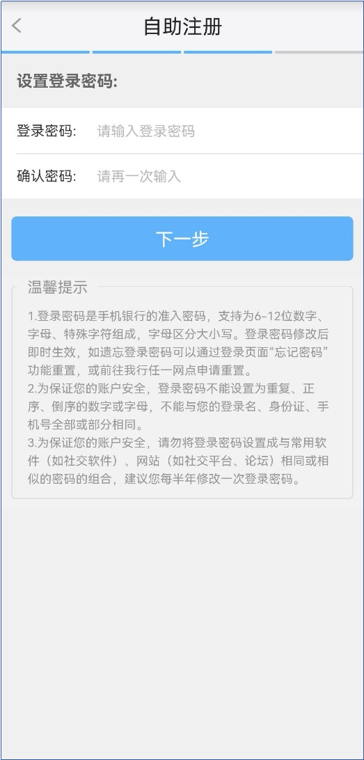 此功能支持客戶自行下載手機銀行后,通過手機銀行自助注冊。自助注冊手機銀行,相關賬戶僅支持辦理繳費,無對外轉賬權限。