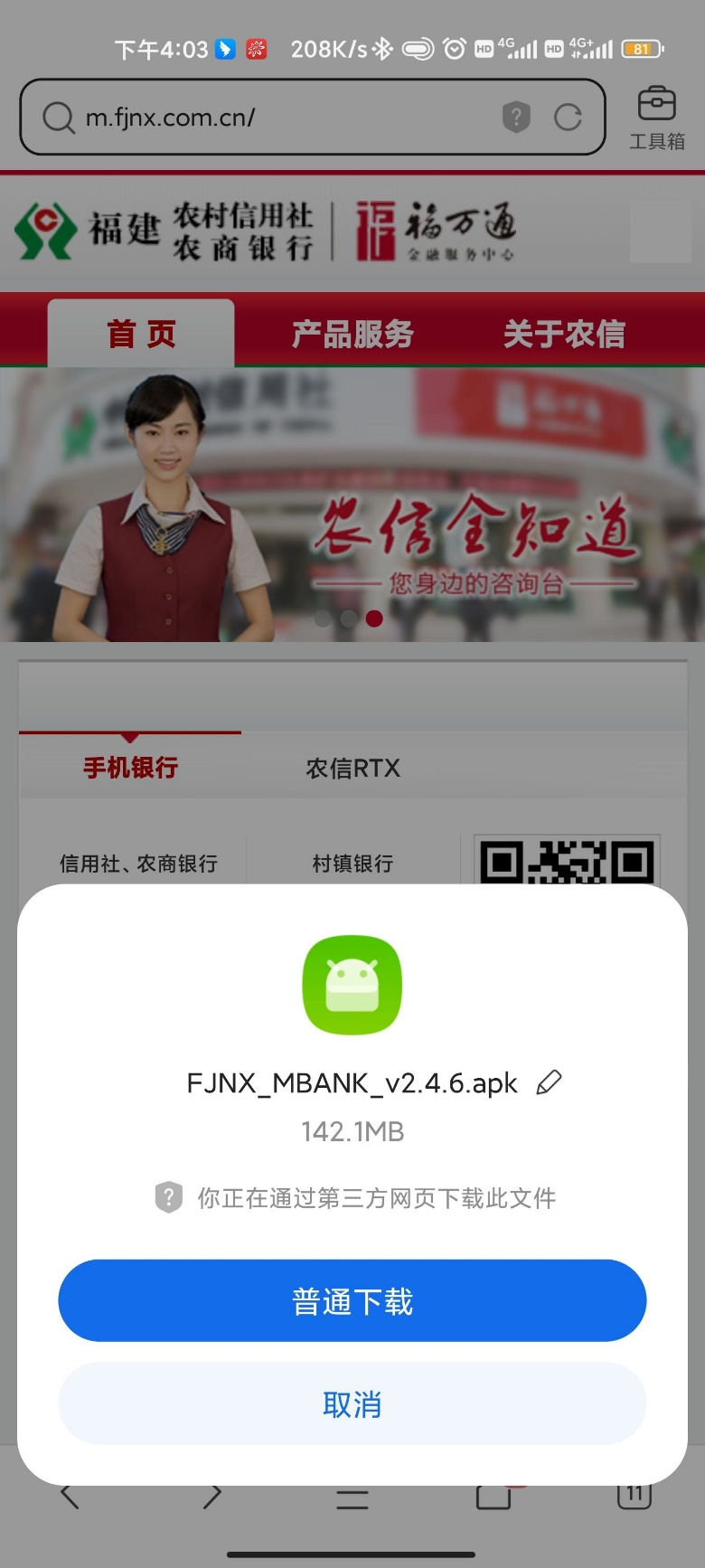 第一步:打開手機瀏覽器,輸入地址“m.fjnx.com.cn”,訪問福建農信移動端門戶網站。