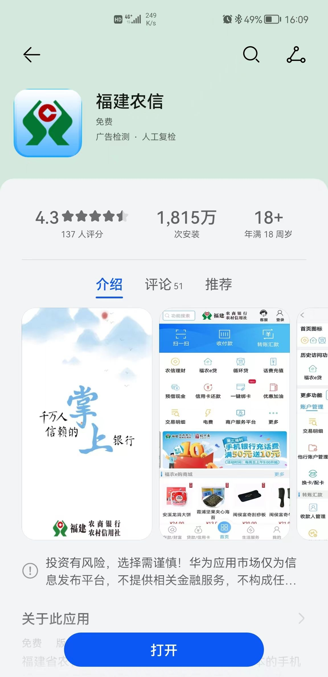 第二步:搜索結果中,選擇“福建農信”,進入應用詳情頁面,根據頁面提示進行安裝、升級、打開應用等操作。